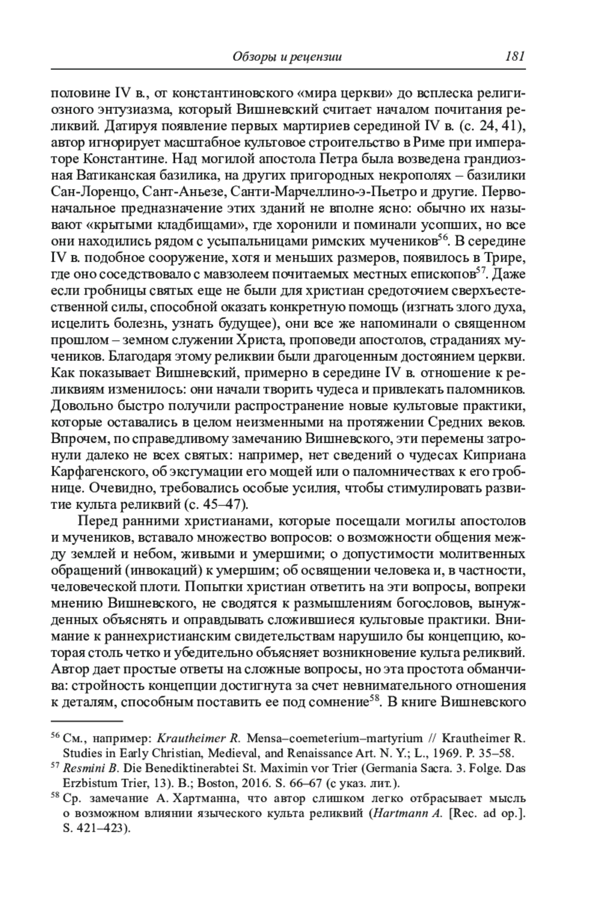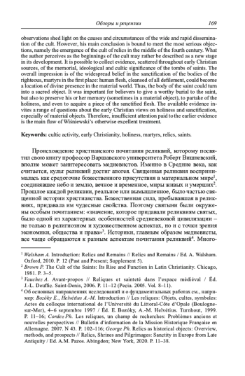 Культ реликвий, унаследованный от поздней античности, стал одной из главных особенностей средневекового христианства. К этой теме обращаются многие медиевисты, поэтому систематический обзор состояния культа в предшествующую эпоху представляет определенный интерес. В своей книге Роберт Вишневский последовательно описывает разные аспекты почитания реликвий в IV–VI вв., обращая особое внимание на способы вступить в контакт со святыней и использовать ее сверхъестественную силу на благо людей. Автор делает интересные наблюдения, которые проливают свет на причины и обстоятельства широкого распространения культа реликвий. Вместе с тем концепция автора вызывает возражения: то, что Вишневский понимает под возникновением культа, можно считать скорее очередным этапом его развития. Рассматривая культ реликвий с определенной точки зрения и руководствуясь средневековыми критериями, автор отрицает его существование до середины IV в. Рецензент высказывает несогласие с этой позицией и приводит свидетельства раннехристианских источников о мемориальном, идеологическом и культовом значении гробниц святых.