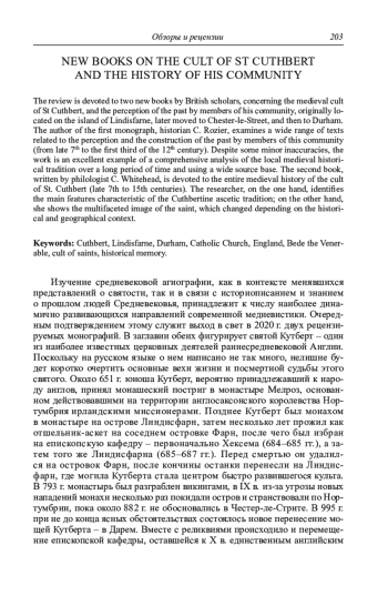 В обзоре рассмотрены две новые книги британских исследователей, посвященные почитанию святого Кутберта в Средние века и восприятию прошлого членами его общины, которая первоначально располагалась на острове Линдисфарн, позднее переместилась в Честер-ле-Стрит, а затем в Дарем. Автор первой рецензируемой монографии, историк Ч. Розье, рассматривает широкий круг текстов, связанных с восприятием и конструированием прошлого членами этой общины (с конца VII по первую треть XII в.). Несмотря на отдельные неточности, работа представляется удачным примером комплексного анализа локальной средневековой историографической традиции на большом временном промежутке и с использованием широкой источниковой базы. Вторая рецензируемая книга написана филологом К. Уайтхед и посвящена всей средневековой истории культа святого Кутберта (конец VII – XV в.). Исследовательница, с одной стороны, выявляет основные черты, характерные для «кутбертовской» аскетической традиции, с другой – показывает многогранный образ святого, менявшийся в зависимости от исторического и географического контекста