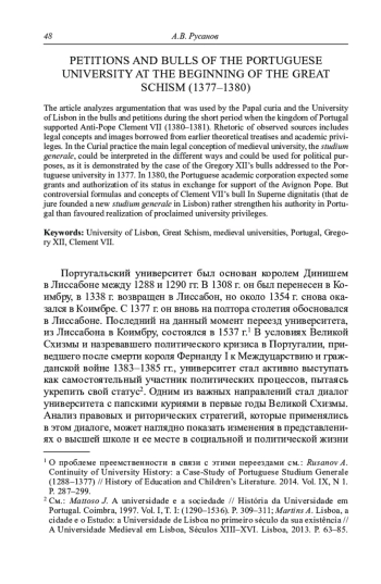 В статье анализируется аргументация, которая использовалась папской курией и Лиссабонским университетом в текстах булл и прошений, составленных в начале Схизмы и в период недолгой поддержки Португальским королевством антипапы Климента VII (1380–1381). Риторика изучаемых источников включает правовые понятие и образы, заимствованные из более ранних юридических трактатов и собраний университетских привилегий. Многие из них, такие как studium generale и universitas, применявшиеся папской курией для регламентации университетской жизни, могли иметь несколько интерпретацийи использоваться в политических целях. Это ярко демонстрирует булла папы Григория XII, отправленная Португальскому университету в 1377 г. В 1380 г. португальская ученая корпорация ожидала, что в благодарность за поддержку авиньонского папы она получит значительные пожалования и подтверждение преемственности своего высокого статуса. Однако Климент VII в булле «In Superne dignitatis» использовал ряд противоречивых формулировок, de jure основав в Лиссабоне новый studium generale, что позволило ему продемонстрировать полноту своей власти, не предоставляя новые привилегии Португальскому университету. Однако участие в диалоге с понтификом способствовало трансформации представлений академического сообщества о своем месте в обществе