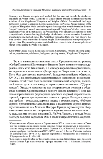 Те, кто начинали постижение эпохи Средневековья по роману «Собор Парижской Богоматери» Виктора Гюго, помнят о «короле дураков», коим стал Квазимодо, и о «цезаре королевства арготинцев», восседавшем в знаменитом «Дворе чудес». Затрагивая эти сюжеты, Гюго был достаточно историчен 1. Западноевропейское общество XV–XVII вв. изобиловало всевозможными «королями» и «королевствами». Этой теме был посвящен тематический сборник, вышедший свыше десяти лет назад, с характерным названием: «”Другие короли”: Этюды о королевстве как иерархическом понятии в обществах позднего Средневековья и раннего Нового времени»2. Речь там шла о короле базоши (корпорации судебных клерков), королях менестрелей, королях «риторических палат» в городах Фландрии, «королях гербов» – герольдах, королях нищих и королях воров, «бобовом короле» праздничного застолья и даже о шахматном короле, причем эту статью писал сам Мишель Пастуро.