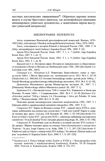 10. Старченко Н.С. Евреи на Волыни в конце XVI - первой трети XVII в.: некоторые наблюдения над непростым соседством // Свой или чужой? Евреи и славяне глазами друг друга / под ред. О.В. Беловой. М., 2003. С. 92-104.