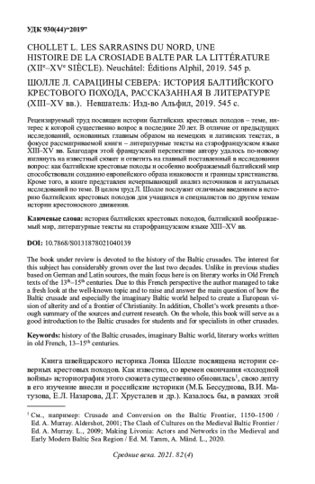 Рецензируемый труд посвящен истории балтийских крестовых походов – теме, интерес к которой существенно возрос в последние 20 лет. В отличие от предыдущих исследований, основанных главным образом на немецких и латинских текстах, в фокусе рассматриваемой книги – литературные тексты на старофранцузском языке XIII–XV вв. Благодаря этой французской перспективе автору удалось по-новому взглянуть на известный сюжет и ответить на главный поставленный в исследовании вопрос: как балтийские крестовые походы и особенно воображаемый балтийский мир способствовали созданию европейского образа инаковости и границы христианства. Кроме того, в книге представлен исчерпывающий анализ источников и актуальных исследований по теме. В целом труд Л. Шолле послужит отличным введением в историю балтийских крестовых походов для учащихся и специалистов по другим темам истории крестоносного движения