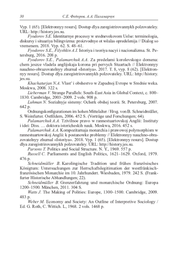5. Паламарчук А. А. Композитарная монархия и правовой полиморфизм в раннестюартовской Англии: к постановке проблемы // Электронный научно-образовательный жу рнал “История”. 2018. Выл. 1 (65). [Электронный ресурс]. Доступ для зарегистрированных пользователей. URL: http://history.jes.su. EDN: XNZHFJ