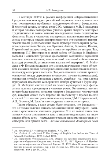 17 сентября 2019 г. в рамках конференции «Переосмысление Средневековья или аудит российской медиевистики» прошла сессия, посвященная проблемам западноевропейского феодализма. В ходе этой сессии, которую вели С. Ю. Агишев и М. В. Винокурова и которая длилась полтора часа, удалось кратко обсудить некоторые традиционные и новые аспекты исследования этого социального феномена. Были, в частности, подчеркнуты важные признаки феодализма, о которых писали как представители отечественной исторической школы (исследовавшие его на примере таких стран и регионов средневекового Запада, как Франция, Англия, Германия, Италия, Пиренейский полуостров), так и многие зарубежные авторы. Так, например, П. Г. Виноградов в своей работе «Villainage in England» выделял 3 основных признака феодализма: соединение верховной власти с землевладением; замена полной земельной собственности (аллода) условной; установление вассальной иерархии 1. Ф. Мейтленд и Ф. Поллок разделяли это мнение, подчеркивая тезис об особом значении личных договорных отношений господства и подчинения между сеньором и вассалом. Так, они отмечали наличие трояких отношений между держателем и сеньором: личные (коммендация), отношения службы, связанные с землей, судебные – т. е. право лорда принуждать население сеньории или манора судиться в курии лорда 2. Ф. Мейтденд считал одной из самых характерных черт феодализма наличие юрисдикции в частных руках. Он отмечал, что нет ничего более важного, когда мы говорим о феодализме, чем частный суд, который может быть передан по наследству и продан вместе с землей. Это мнение разделили впоследствии Д. М. Петрушевский, А. Я. Гуревич, М. Блок3 и многие другие известные историки
