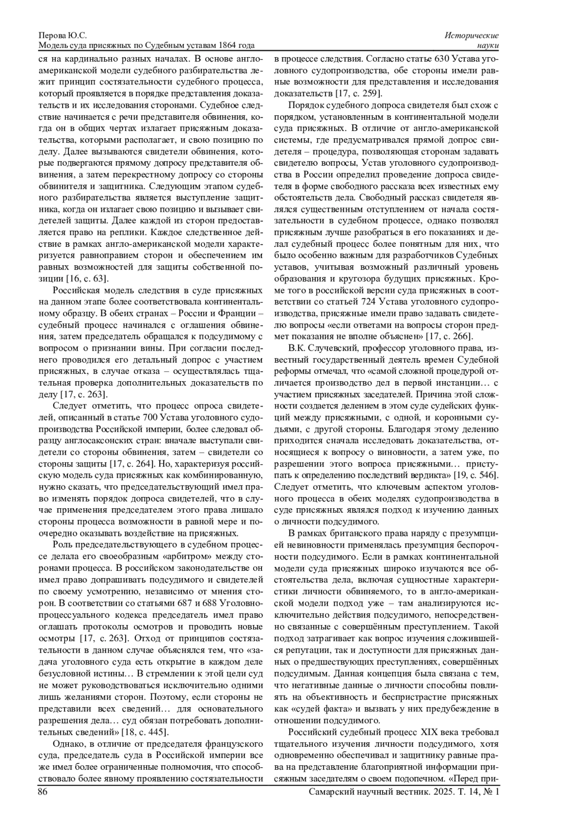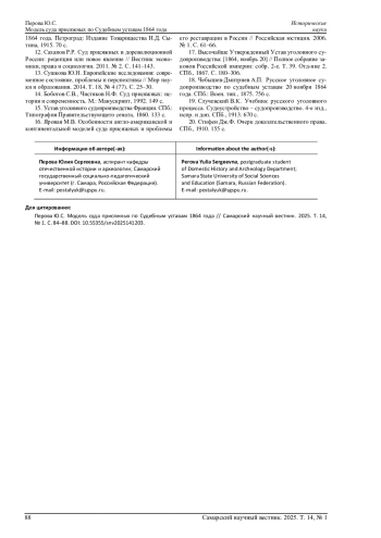 ПЕРОВА Ю. С. МОДЕЛЬ СУДА ПРИСЯЖНЫХ ПО СУДЕБНЫМ УСТАВАМ 1864 ГОДА // САМАРСКИЙ НАУЧНЫЙ ВЕСТНИК. 2025. ТОМ 14, № 1