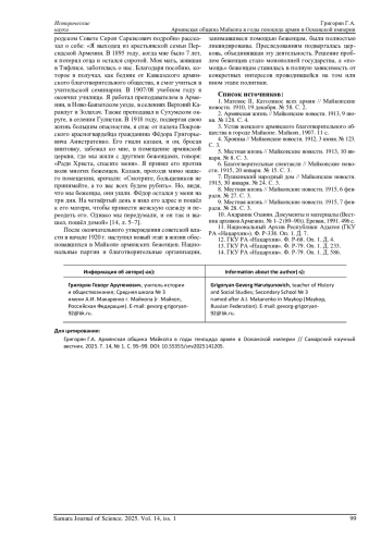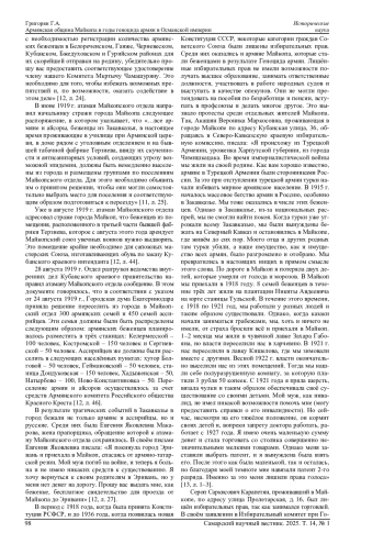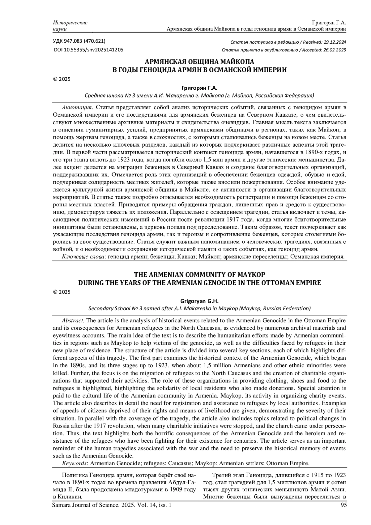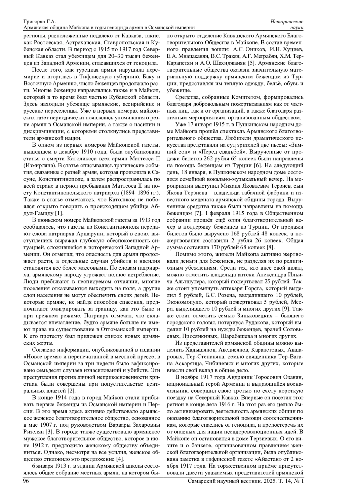ГРИГОРЯН Г. А. АРМЯНСКАЯ ОБЩИНА МАЙКОПА В ГОДЫ ГЕНОЦИДА АРМЯН В ОСМАНСКОЙ ИМПЕРИИ // САМАРСКИЙ НАУЧНЫЙ ВЕСТНИК. 2025. ТОМ 14, № 1