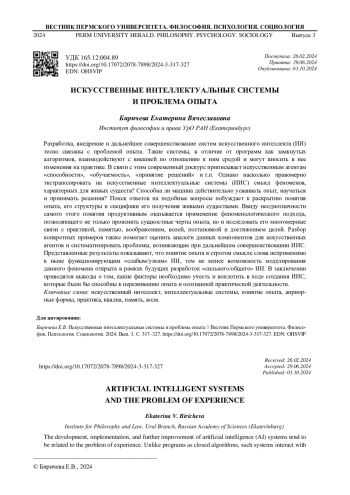 Разработка, внедрение и дальнейшее совершенствование систем искусственного интеллекта (ИИ) тесно связаны с проблемой опыта. Такие системы, в отличие от программ как замкнутых алгоритмов, взаимодействуют с внешней по отношению к ним средой и могут вносить в нее изменения на практике. В связи с этим современный дискурс приписывает искусственным агентам «способности», «обучаемость», «принятие решений» и т. п. Однако насколько правомерно экстраполировать на искусственные интеллектуальные системы (ИИС) смысл феноменов, характерных для живых существ? Способна ли машина действительно усваивать опыт, научаться и принимать решения? Поиск ответов на подобные вопросы побуждает к раскрытию понятия опыта, его структуры и специфики его получения живыми существами. Ввиду неоднозначности самого этого понятия продуктивным оказывается применение феноменологического подхода, позволяющего не только прояснить сущностные черты опыта, но и исследовать его многомерные связи с практикой, памятью, воображением, волей, постановкой и достижением целей. Разбор конкретных примеров также помогает оценить аналоги данных компонентов для искусственных агентов и систематизировать проблемы, возникающие при дальнейшем совершенствовании ИИС. Представленные результаты показывают, что понятие опыта в строгом смысле слова неприменимо к ныне функционирующим «слабым/узким» ИИ, тем не менее возможность моделирования данного феномена открыта в рамках будущих разработок «сильного/общего» ИИ. В заключении приводятся выводы о том, какие факторы необходимо учесть и воплотить в ходе создания ИИС, которые были бы способны к переживанию опыта и осознанной практической деятельности.