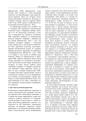 Искусственные интеллектуальные системы (ИИС) все активнее внедряются в практику во всех смыслах этого слова. Речь не только об изменениях, вносимых в эмпирическую реальность, будь то генерация новых «произведений», «умная» автоматизация производства или беспилотное управление. По меткому замечанию П. Вирно, «праксис» как выбор/поступок в сфере публичного (или политического) действия сегодня неразделимо переплетается с «общим интеллектом» [Вирно П., 2013, с. 7374].