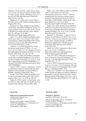 5. Биричева Е.В. Воля в концепции сильного искусственного интеллекта // Гуманитарное знание и искусственный интеллект: стратегии и инновации: 4-й молодежный конвент УрФУ: материалы международ. конф. (Екатеринбург, 26 марта 2020 г.). Екатеринбург: Изд-во Урал. ун-та, 2020. С. 1009-1012.
