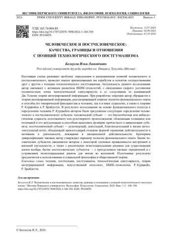 БЕЛОУСОВ И. Л. ЧЕЛОВЕЧЕСКОЕ И ПОСТЧЕЛОВЕЧЕСКОЕ: КАЧЕСТВА, ГРАНИЦЫ И ОТНОШЕНИЯ С ПОЗИЦИЙ ТЕХНОЛОГИЧЕСКОГО ПОСТГУМАНИЗМА // ВЕСТНИК ПЕРМСКОГО УНИВЕРСИТЕТА. ФИЛОСОФИЯ. ПСИХОЛОГИЯ. СОЦИОЛОГИЯ. 2024. № 3