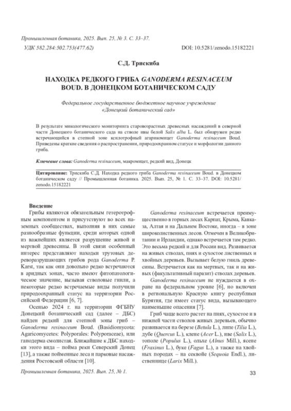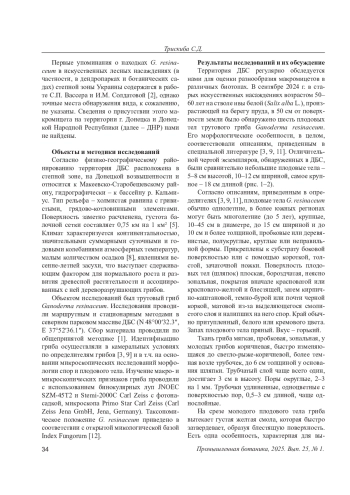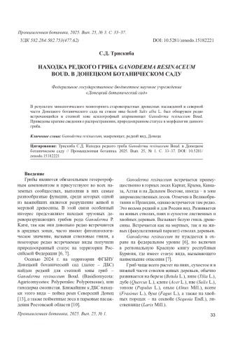 Грибы являются обязательным гетеротрофным компонентом и присутствуют во всех наземных сообществах, выполняя в них самые разнообразные функции, среди которых одной из важнейших является разрушение живой и мертвой древесины. В этой связи особенный интерес представляют находки трутовых дереворазрушающих грибов рода Ganoderma P. Karst, так как они довольно редко встречаются в аридных зонах, часто имеют фитопатологическое значение, вызывая стволовые гнили, а некоторые редко встречаемые виды получили природоохранный статус на территории Российской Федерации [6, 7].