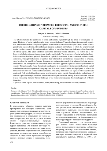 В статье рассмотрены определения социального и культурного капиталов через призму социологической науки. Также приведены виды социального капитала: открытый и закрытый. Виды культурного: инкорпорированный, объективированный и институционализированный. Сделан акцент на основных факторах социального капитала - доверие, нормы взаимности и социальные сети. Роберт Патнем выделяет индикаторы, на основе которых можно измерить уровень социального капитала. Авторы дали определение габитусу как одному из важных индикаторов формирования культурного капитала. В статье указаны факторы, которые влияют на культурное просвещение, среди которых: уровень образования, среда и семья, круг общения. Актуализирована значимость социального и культурного капиталов для студенческой молодежи. Рассмотрено соотношение капиталов в контексте социально-экономических условий. Через функции капиталов выявляется их взаимосвязь и влияние друг на друга. Также опираясь на специфику формирования капиталов, авторы определили их взаимосвязь в студенческой среде. Сделано предположение о том, почему в обществе неравномерно распределены данные виды капиталов. Также авторы выявили, что закрытый социальный капитал в связке с инкорпорированным культурным капиталом способствуют развитию внутригруппового доверия. Выделена внеучебная деятельность как фактор связи культурного и социального капиталов. Семейная реликвия является аспектом, в котором совмещены рассматриваемые капиталы. Народное творчество (фольклор) представлено в виде фактора, объединяющего капиталы. Образование является воплощением культурного капитала в инкорпорированной форме. Авторы дают определение постиндустриальному обществу для того, чтобы в дальнейшем указать его в качестве связывающего элемента. Методологией работы выступает структурно-функциональный подход Пьера Бурдье.