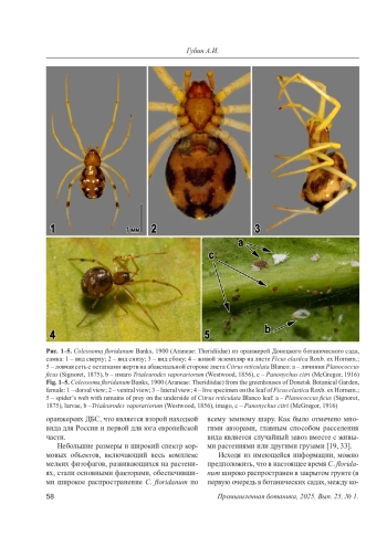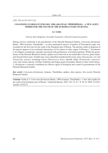В ходе обследований, проведенных в оранжереях Донецкого ботанического сада, впервые для юга европейской части России был выявлен Coleosoma floridanum Banks, 1900 (Araneae: Theridiidae) – чужеродный пантропический вид пауков неотропического происхождения. Основным способом расселения вида является случайный завоз вместе с живыми растениями или другими грузами. В Европе вид является облигатным синантропом, связанным c теплицами и оранжереями ботанических садов. В оранжереях Донецкого ботанического сада вид регистрировали на абаксиальной стороне листьев, стволах растений и под цветочными горшками. В качестве объектов питания были отмечены растительноядные клещи Panonychus citri и Tetranychus urticae, личинки мучнистого червеца Planococcus ficus, имаго белокрылки Trialeurodes vaporariorum, различные виды трипсов (Tripidae) и сциарид (Sciaridae). В настоящее время C. floridanum рассматривается нами как эффективный агент биологической борьбы с вредителями в закрытом грунте Донецкого ботанического сада.