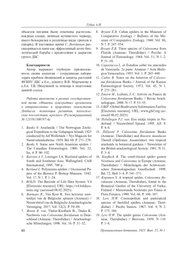 15. Hillyard P. Coleosoma floridanum Banks (Araneae: Theridiidae) and Boeorix manducus Thorell (Opiliones: Assamiidae): two tropical arachnids in botanical gardens // Newsletter of the British arachnological Society. 1981. N 31. P. 3-4.
