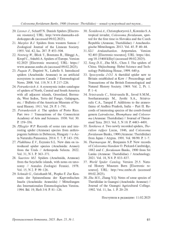 30. Šestáková A., Christophoryová J., Korenko S. A tropical invader, Coleosoma floridanum, spotted for the first time in Slovakia and the Czech Republic (Araneae, Theridiidae) // Arachnologische Mitteilungen. 2013. Vol. 45. P. 40-44.