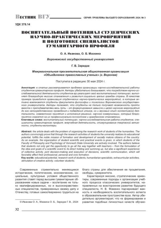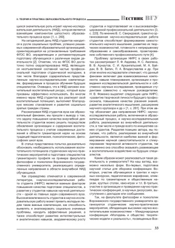 В статье рассматривается проблема организации научно-исследовательской работы студентов гуманитарного профиля. Авторы убедительно доказывают, что посредством научно-исследовательской деятельности студентов вуз реализует свой воспитательный потенциал, выполняет благородную миссию становления и развития социально зрелых граждан страны. В качестве примера приводится организация студенческих научно-практических мероприятий, в которые активно вовлекаются студенты факультета философии и психологии Воронежского государственного университета. Авторы полагают, что студенты не только получают возможность пройти вместе с преподавателями весь путь - от формулирования замысла и целей научного мероприятия до его непосредственного проведения и подведения итогов, но и весомый опыт коллективной деятельности, совместного принятия и исполнения решений, научной коммуникации, который благоприятно скажется на их профессионально-личностном и гражданском становлении.
