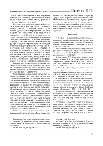 5. Ковтуненко Л. В. Формирование научно-исследовательской культуры студента - будущего педагога в исследовательской работе / Л. В. Ковтуненко, М. А. Лопаева // Вестник Воронежского государственного университета. Серия: Проблемы высшего образования. - 2023. - № 2. - С. 61-65. EDN: WPFYSY
