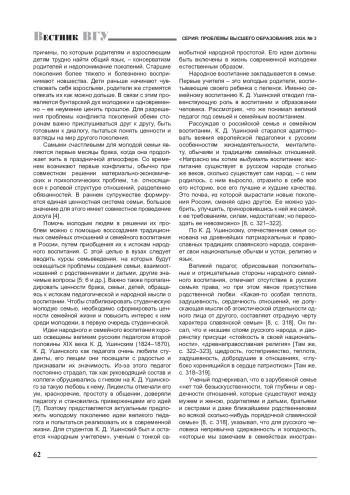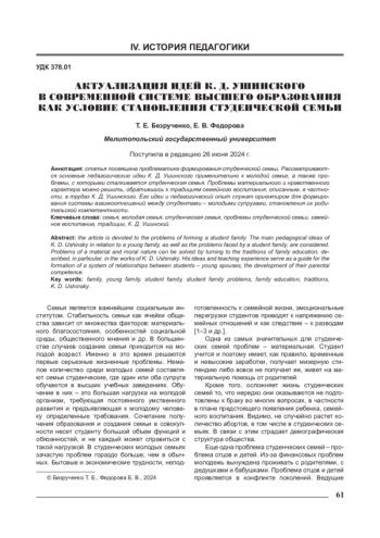 Претворение идей К. Д. Ушинского о семейном воспитании в содержании вузовского образовательного процесса способствует формированию у студентов родительской компетентности, прочной нравственной основы для воспитательной деятельности в их собственных семьях, опоре на традиционные семейные ценности, характерные для российской культуры. Тем самым можно помочь студентам как будущим родителям и тем студентам, кто уже создал свои семьи и имеет маленьких детей, стать эффективными воспитателями, предупредить возможные конфликты, которые могут возникать в семьях на почве расхождений во взглядах отца и матери на воспитание детей либо в силу недостаточной психолого-педагогической грамотности взрослых членов семьи, научить находить и использовать в первую очередь позитивные аспекты внутрисемейных отношений, иным словом, строить здоровую, крепкую и счастливую семью.