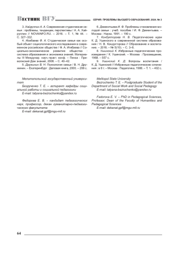 3. Хайруллин А. А. Современная студенческая семья: проблемы, тенденции, перспективы / А. А. Хайруллин // NOVAINFO.RU. - 2016. - Т. 1, № 44. -С. 327-332. EDN: VWBTKV