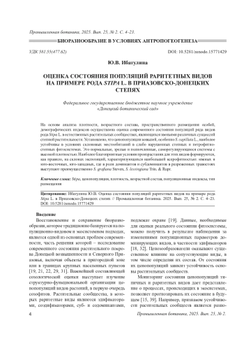 21. Ибатулина Ю.В. Состояние ценопопуляций Stipa ucrainica P.A. Smirn. в степных растительных сообществах в бассейне реки Миус // Экологический Вестник Северного Кавказа. 2024. Т. 20, N 3. С. 94-99.