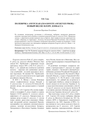На основании литературных источников и собственных гербарных материалов приведены сведения о произрастании в Донбассе полевички амурской (Eragrostis amurensis Prob.). Приведены данные о современном распространении вида в Евразии. Дана морфологическая характеристика особей, собранных на территории г. Луганска (Луганская Народная Республика). Для уточнения распространения E. amurensis в Донбассе необходимо продолжить полевые исследования, а также критически пересмотреть все имеющиеся гербарные материалы Eragrostis pilosa (L.) Beauv. s. str. Донецкого ботанического сада.
