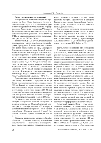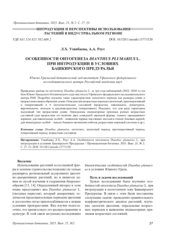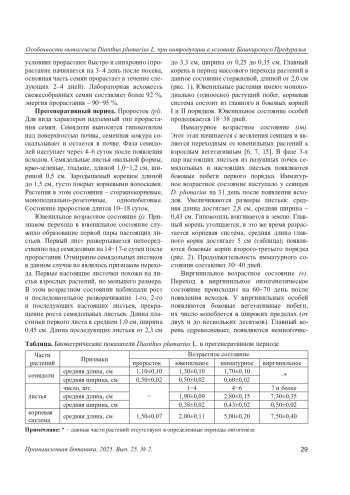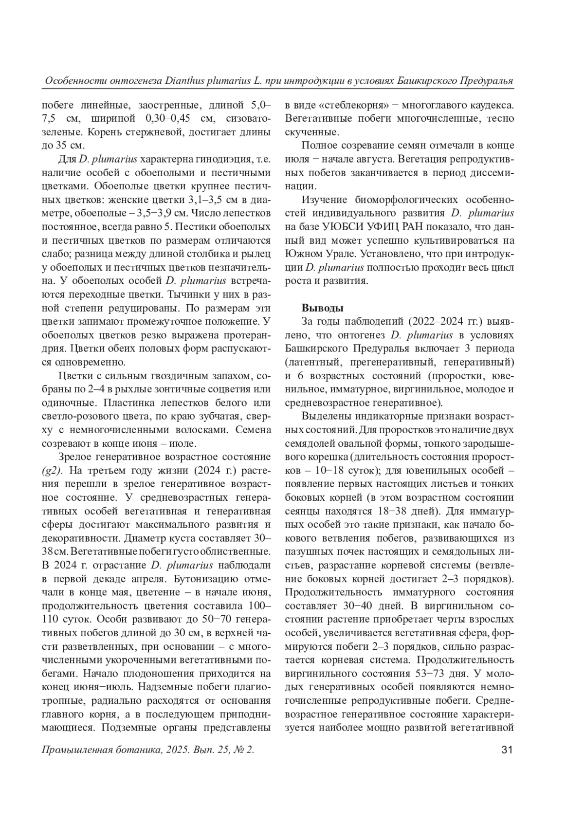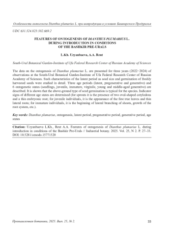Приведены данные по онтогенезу Dianthus plumarius L. за три года наблюдений (2022-2024 гг.) на базе Южно-Уральского ботанического сада-института Уфимского федерального исследовательского центра РАН. Подробно изучены такие характеристики латентного периода как размеры семян и прорастание свежесобранных семян. Описаны три возрастных периода (латентный, прегенеративный и генеративный) и 6 онтогенетических состояний (проростки, ювенильное, имматурное, виргинильное, молодое и средневозрастное генеративное). Показано, что для вида характерен надземный тип прорастания семян. Определены индикаторные признаки разных возрастных состояний (для проростков это наличие двух семядолей овальной формы, тонкого зародышевого корешка; для ювенильных особей - появление первых настоящих листьев и тонких боковых корней; для имматурных особей - начало бокового ветвления побегов, разрастание корневой системы и др.).