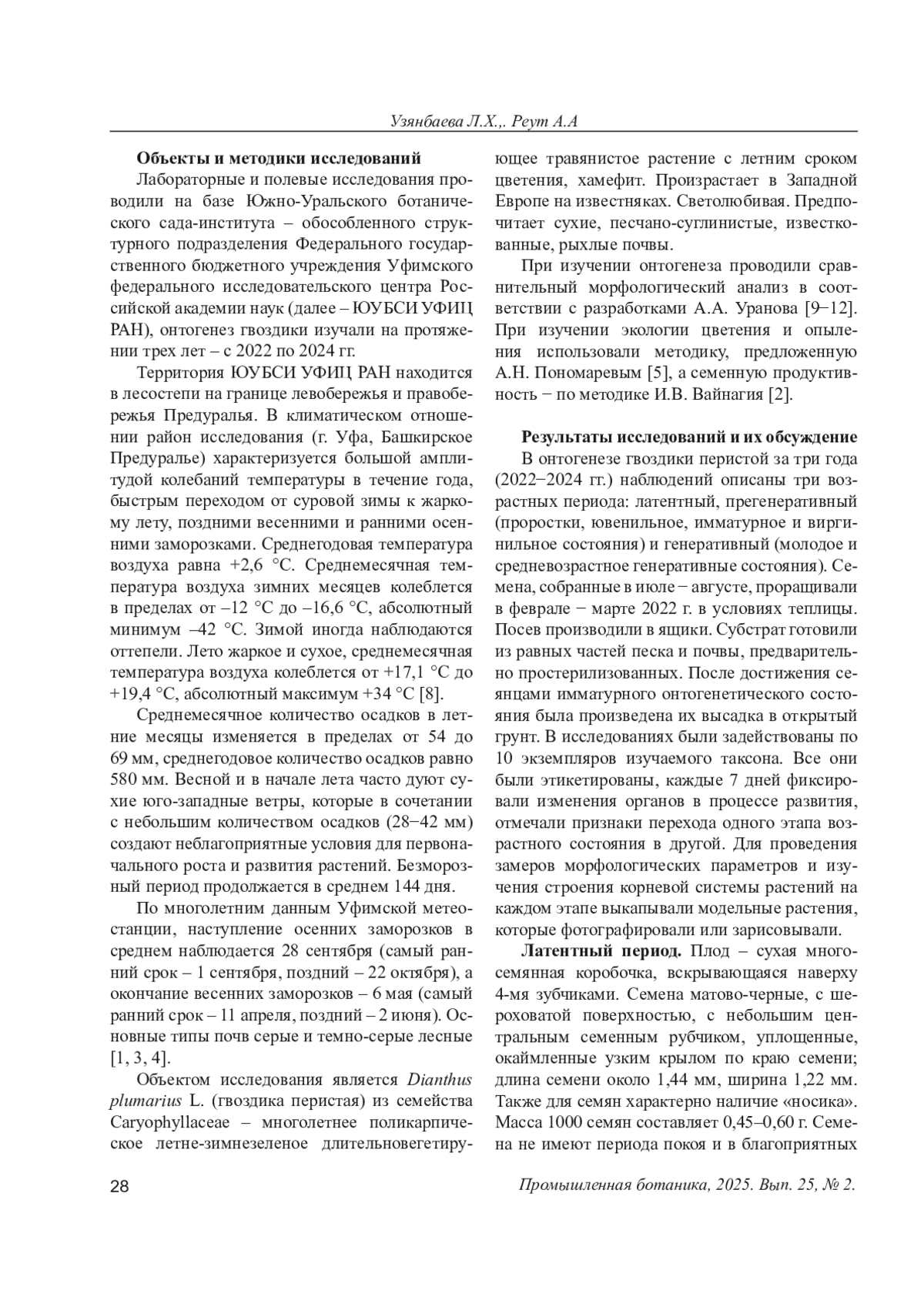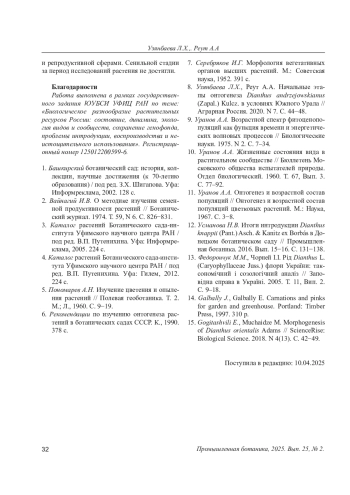 8. Узянбаева Л.Х., Реут А.А. Начальные этапы онтогенеза Dianthus andrzejowskianus (Zapal.) Kulcz. в условиях Южного Урала // Аграрная Россия. 2020. N 7. С. 44-48.