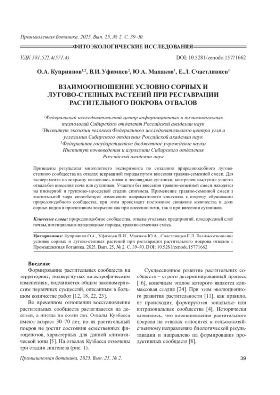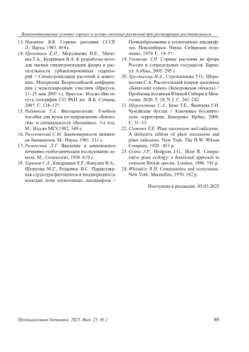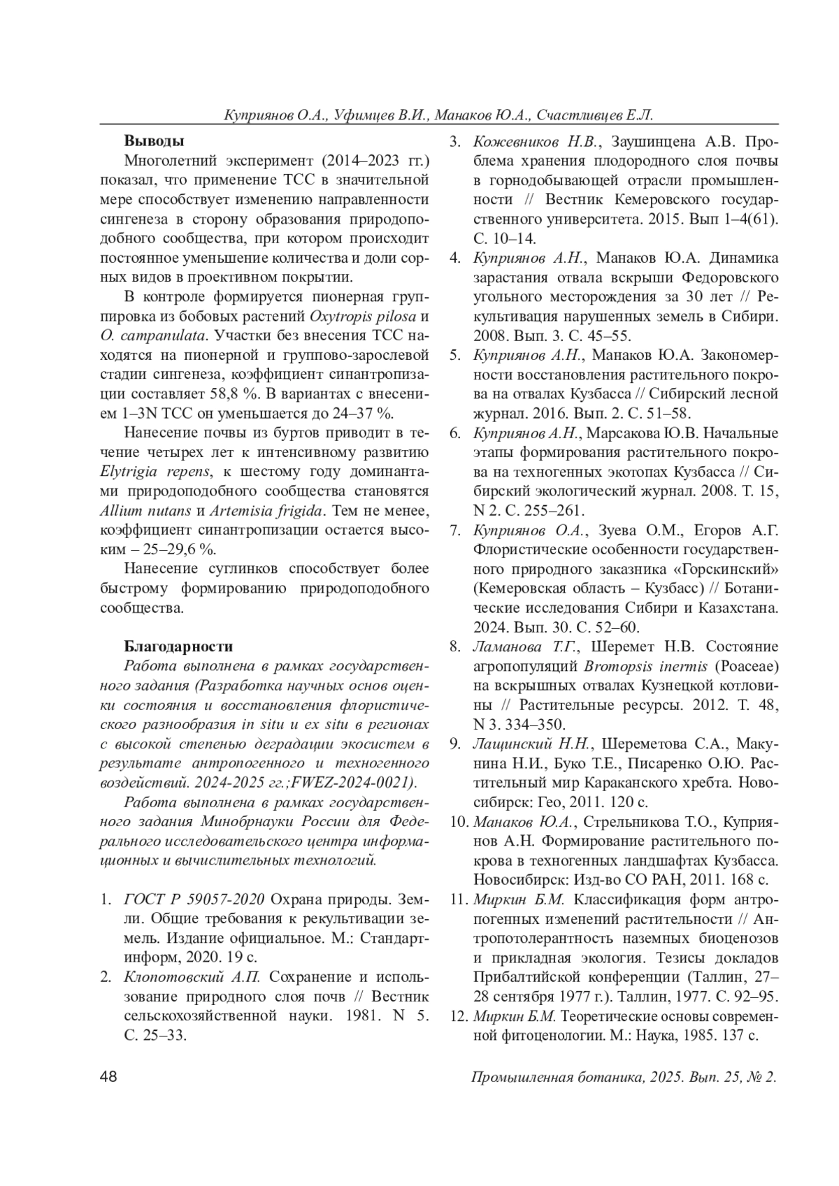 5. Куприянов А.Н., Манаков Ю.А. Закономерности восстановления растительного покрова на отвалах Кузбасса // Сибирский лесной журнал. 2016. Вып. 2. С. 51-58.