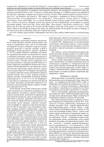 Статья: АНАЛИЗ УЯЗВИМОСТИ ДРЕВЕСНЫХ РАСТЕНИЙ, ПРОИЗРАСТАЮЩИХ В УСЛОВИЯХ УРБОЭКОСИСТЕМ (НА ПРИМЕРЕ ГОРОДА ДОНЕЦКА) (2025)
