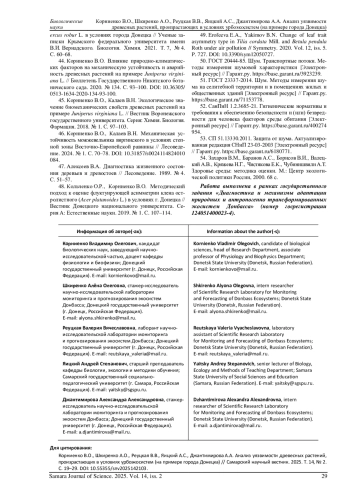 КОРНИЕНКО В. О., ШКИРЕНКО А. О., РЕУЦКАЯ В. В., ЯИЦКИЙ А. С., ДЖАНТИМИРОВА А. А. АНАЛИЗ УЯЗВИМОСТИ ДРЕВЕСНЫХ РАСТЕНИЙ, ПРОИЗРАСТАЮЩИХ В УСЛОВИЯХ УРБОЭКОСИСТЕМ (НА ПРИМЕРЕ ГОРОДА ДОНЕЦКА) // САМАРСКИЙ НАУЧНЫЙ ВЕСТНИК. 2025. ТОМ 14, № 2