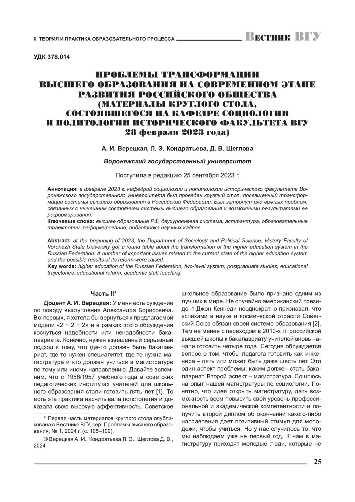 В феврале 2023 г. кафедрой социологии и политологии исторического факультета Воронежского государственного университета был проведен круглый стол, посвященный трансформации системы высшего образования в Российской Федерации. Был затронут ряд важных проблем, связанных с нынешним состоянием системы высшего образования и возможными результатами ее реформирования