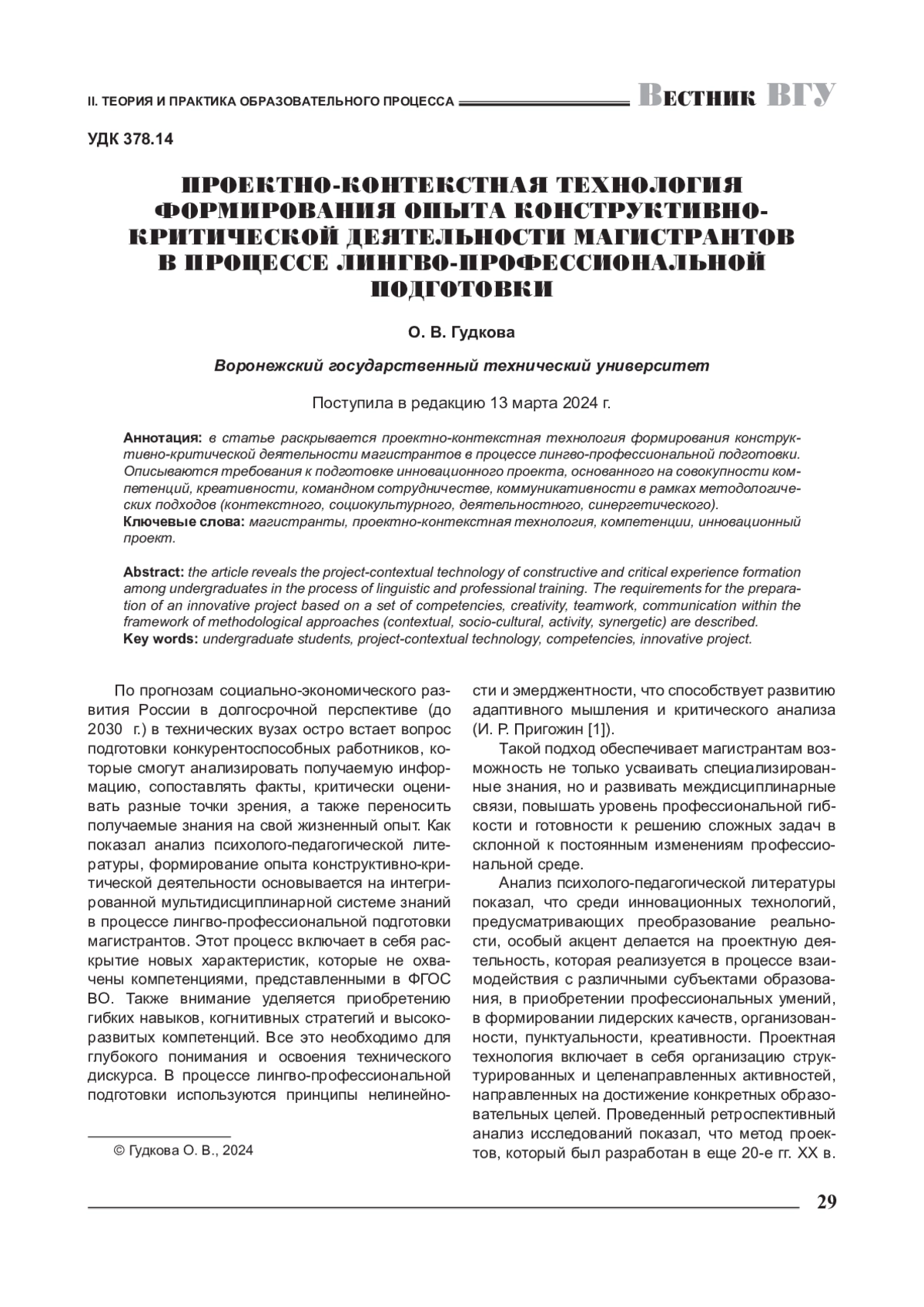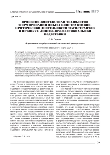 В статье раскрывается проектно-контекстная технология формирования конструктивно-критической деятельности магистрантов в процессе лингво-профессиональной подготовки. Описываются требования к подготовке инновационного проекта, основанного на совокупности компетенций, креативности, командном сотрудничестве, коммуникативности в рамках методологических подходов (контекстного, социокультурного, деятельностного, синергетического).