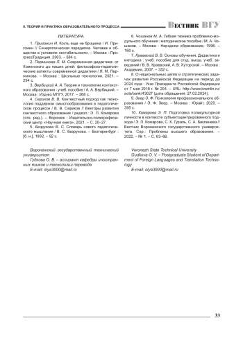 3. Вербицкий А. А. Теория и технологии контекстного образования:учеб.пособие / А. А. Вербицкий. -Москва: Изд-во МПГУ, 2017. - 268 с. EDN: LATCHI