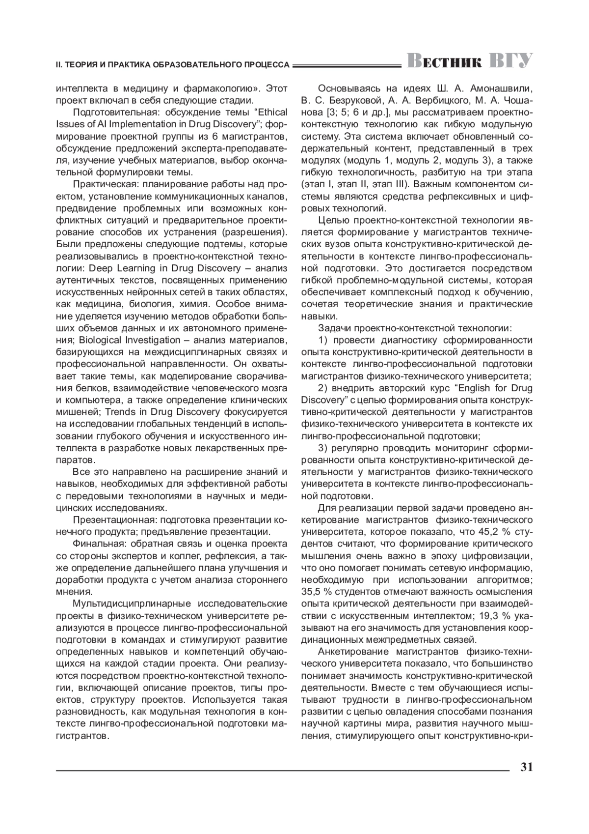 Для реализации первой задачи проведено анкетирование магистрантов физико-технического университета, которое показало, что 45,2 % студентов считают, что формирование критического мышления очень важно в эпоху цифровизации, что оно помогает понимать сетевую информацию, необходимую при использовании алгоритмов; 35,5 % студентов отмечают важность осмысления опыта критической деятельности при взаимодействии с искусственным интеллектом; 19,3 % указывают на его значимость для установления координационных межпредметных связей.