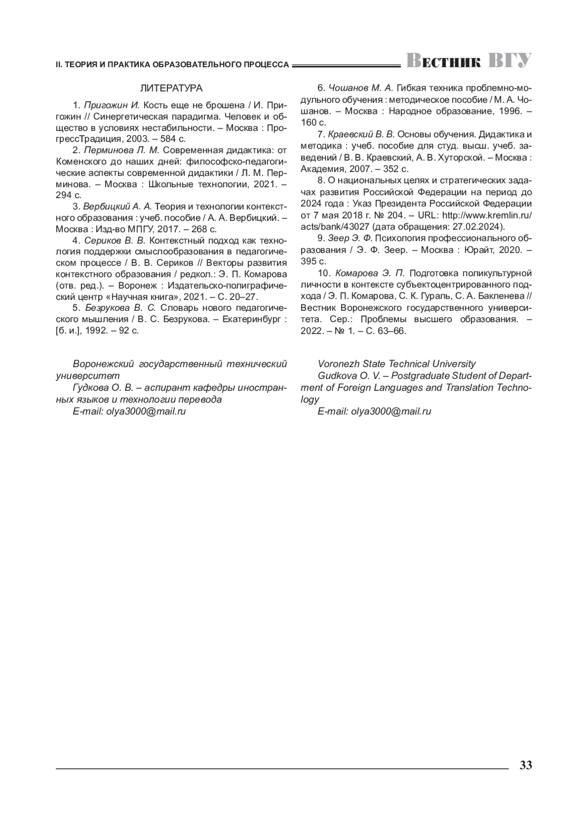 10. Комарова Э. П. Подготовка поликультурной личности в контексте субъектоцентрированного подхода / Э. П. Комарова, С. К. Гураль, С. А. Бакленева // Вестник Воронежского государственного университета. Сер.: Проблемы высшего образования. - 2022. - № 1. - С. 63-66. EDN: RFWRFM