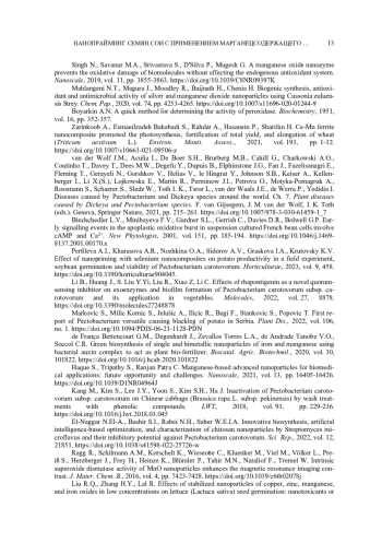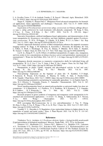 25. Venzhik Y. V., Deryabin A. N. Regulation of pro-/antioxidant balance in higher plants by nanoparticles of metals and metal oxides // Russ. J. Plant Physiol. 2023. Vol. 70, N 2. P. 133-147.