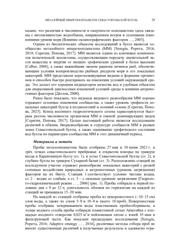 18. Серегин С. А., Попова Е. В. Обилие, видовое разнообразие и структура сообщества метазойного микрозоопланктона в градиенте бухта-взморье (на примере Севастопольской бухты) // Морской биологический журнал. 2023. Т. 8, № 2. С. 74-90. DOI: 10.21072/mbj.2023.08.2.05