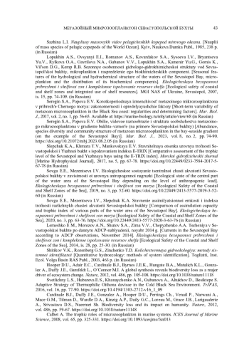38. Stelmakh L., Kovrigina N. Phytoplankton Growth Rate and Microzooplankton Grazing under Conditions of Climatic Changes and Anthropogenic Pollution in the Coastal Waters of the Black Sea (Sevastopol Region) // Water. 2021. Vol. 13, Is. 22. 3230. DOI: 10.3390/w13223230