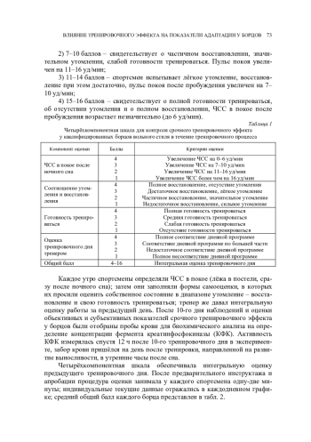 Обсуждаются результаты анализа функционального состояния квалифицированных борцов вольного стиля после срочного тренировочного эффекта, полученные по объективным и субъективным параметрам: изменению частоты сердечных сокращений, содержанию креатинфосфокиназы в крови, соотношению показателей утомление/восстановление, оценке готовности тренироваться и оценке результатов тренировочного дня тренером.