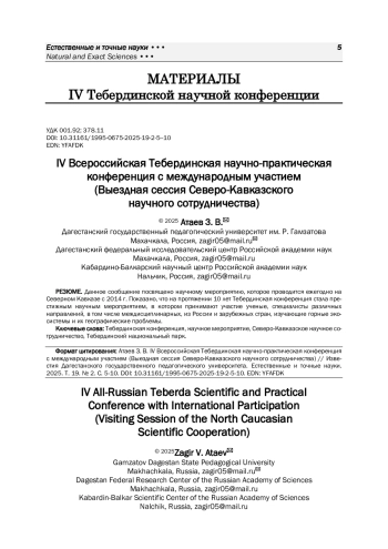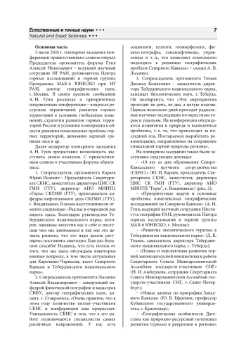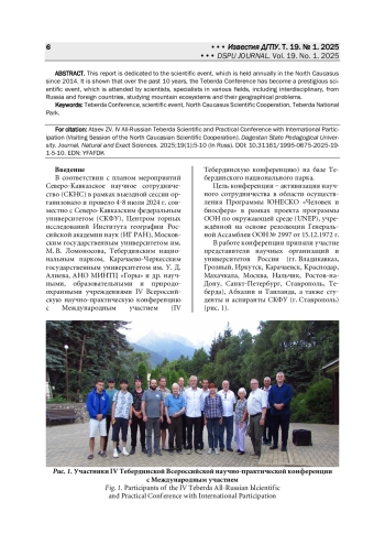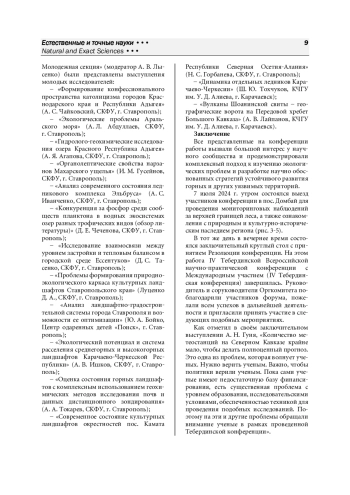 В соответствии с планом мероприятий Северо-Кавказское научное сотрудничество (СКНС) в рамках выездной сессии организовало и провело 4-8 июля 2024 г. сов-местно с Северо-Кавказским федеральным университетом (СКФУ), Центром горных исследований Института географии Российской академии наук (ИГ РАН), Москов-ским государственным университетом им. М. В. Ломоносова, Тебердинским национальным парком, Карачаево-Черкесским государственным университетом им. У. Д. Алиева, АНО МИНТЦ «Горы» и др. науч-ными, образовательными и природоохранными учреждениями IV Всероссийскую научно-практическую конференцию с Международным участием (IV Тебердинскую конференцию) на базе Тебердинского национального парка.