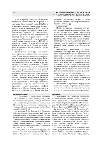 Целью работы является выявление особенностей структуры и динамики береговых геосистем Государственного природного заповедника «Утриш». Методы. Полевое ландшафтное профилирование в прибрежной морской и наземной части вдоль берегов разного типа, сравнительно-географический анализ. Результаты. На основе полевых данных построены ландшафтные профили береговых геосистем, выявлены особенности их структуры и динамики в летний период 2019 и 2023 гг. Выводы. Пространственная структура изученных наземных и донных природных комплексов у берегов в разные годы может отличаться вследствие неодинаковой силы волнового воздействия, характера распределения отложений вдоль подводного берегового склона. В целом основные различия в структуре приурезовой части у разных типов берега сохраняются.