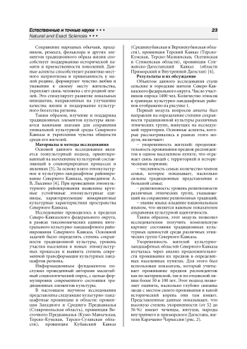 Северный Кавказ является уникальным регионом России, представляющим собой, по сути, этническую мозаику различных культур. Здесь, на сравнительно небольшой территории, в течение нескольких веков проживают десятки этнических групп. Уникальность региона заключается еще и в том, что, несмотря на все модернизационные и глобализационные процессы, активно происходящие в современном мире, этнический регионализм народов Северного Кавказа остается ярко выраженным и, характеризуя ситуацию в целом, этнокультурной ассимиляции не происходит. Хотя нельзя не отметить и существенные этнокультурные трансформации, особенно в культуре жизнеобеспечения [1].
