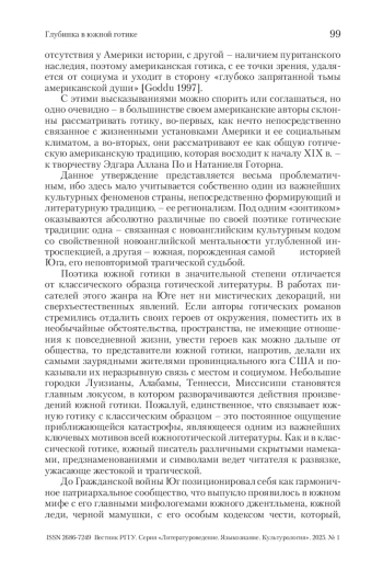 Американская готика представляет собой сложное культурное и литературное явление, обеспеченное региональной спецификой США. Под «зонтиком» термина помещаются две своеобразные традиции готической литературы – новоанглийская, в большей степени сфокусированная на погружении в глубины человеческой психики и тщательно фиксирующая различные рефлексии персонажей, и южная, обязанная своим появлением тяжелым переживаниям и размышлениям южан по поводу смерти мифологического прекрасного Юга в результате Гражданской войны. В силу специфической социокультурной жизни на Юге не было крупных урбанистических центров, сердцем Юга является глубинка, с характерной для нее укорененностью в традициях прошлого. Южная глубинка – скорее топос, обобщенное место разворачивания смыслов, связанных с уникальным южным опытом жизни, часто набор устойчивых фабульных формул, а также общих мотивов, проблем и сюжетов. В статье рассматриваются некоторые типические черты поэтики южной готики.