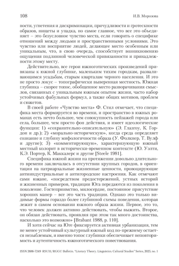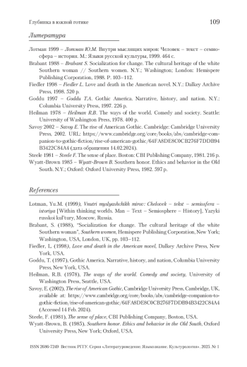 7. Steele 1981 - Steele F. The sense of place. Boston: CBI Publishing Company, 1981. 216 p. Wyatt-Brown 1985 - Wyatt-Brown B. Southern honor. Ethics and behavior in the Old South. N.Y.; Oxford: Oxford University Press, 1982. 597 p.