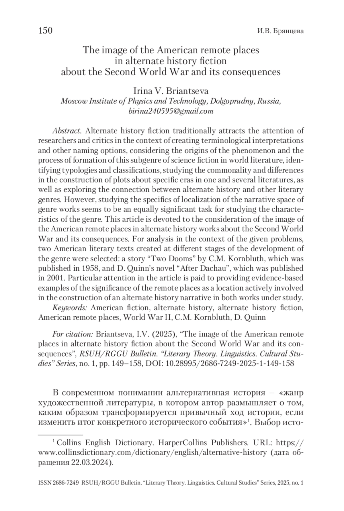 Альтернативно-исторические художественные тексты традиционно притягивают внимание исследователей и критиков в контексте создания терминологических трактовок и иных вариантов наименования, рассмотрения истоков зарождения феномена и процесса формирования данного поджанра фантастики в мировой литературе, выявления типологий и классификаций, изучения общности и различий построения сюжетов о конкретных эпохах в пределах одной и нескольких литератур, а также исследования связи альтернативной истории с другими литературными жанрами. Однако изучение специфики локализации художественного пространства жанровых произведений представляется не менее значимой задачей для исследования особенностей жанра. Данная статья посвящена рассмотрению образа американской глубинки в альтернативно-исторических произведениях о Второй мировой войне и ее последствиях. Для анализа в контексте заданной проблематики выбраны два американских художественных текста, созданных на разных этапах развития жанра: изданная в 1958 г. повесть С. М. Корнблата «Две судьбы» и увидевший свет в 2001 г. роман Д. Куинна «После Дахау». Особое внимание в статье уделяется приведению доказательных примеров о значимости глубинки как локации, активно задействованной в построении альтернативно-исторического нарратива в обоих исследуемых произведениях.