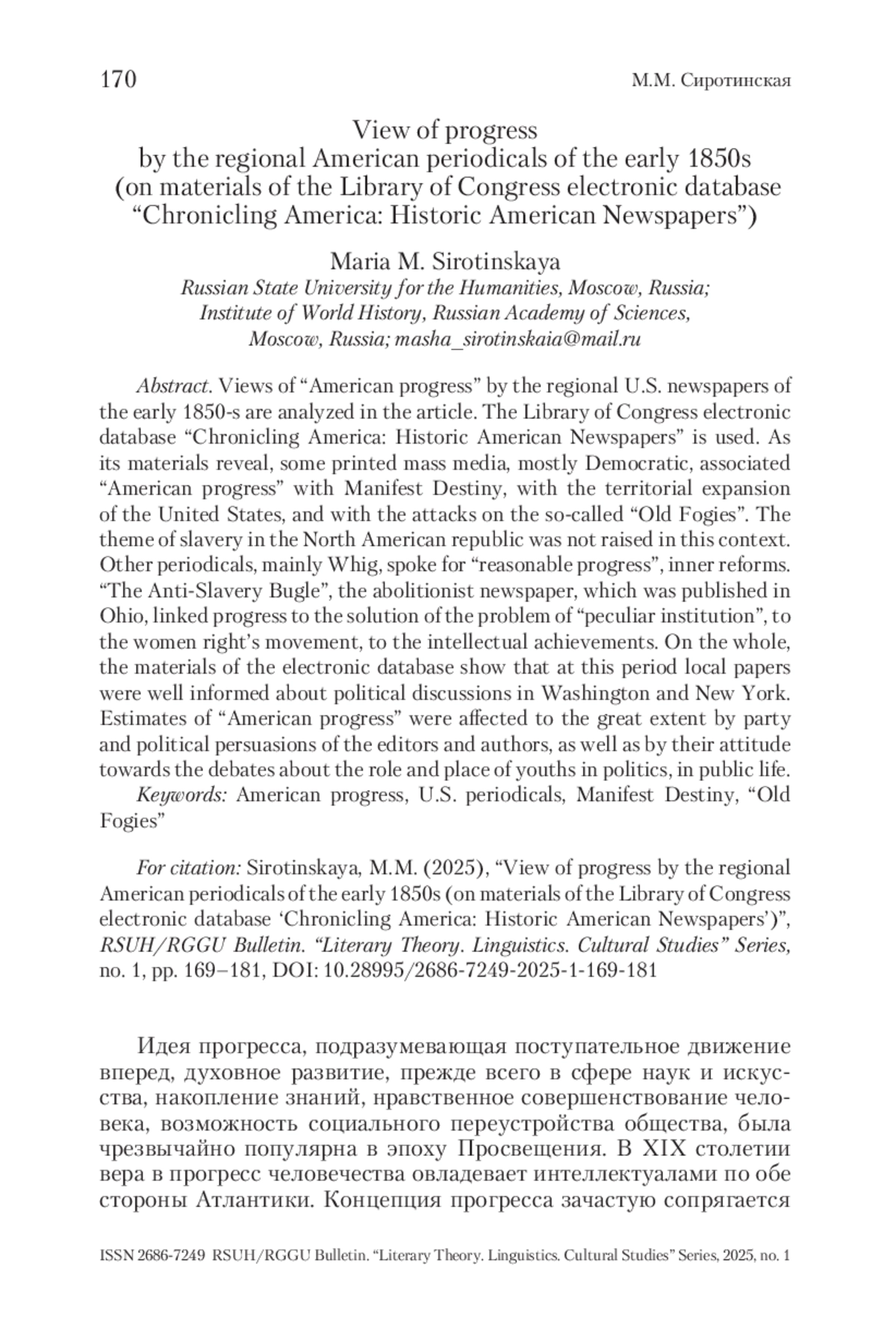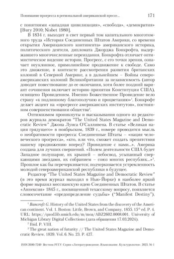 3. Сиротинская 2017 - Сиротинская М.М. Идея «предопределения судьбы» в восприятии американских современников: середина XIX в. // Вестник РГГУ. Серия «Политология. История. Международные отношения». 2017. № 2. С. 101-113.