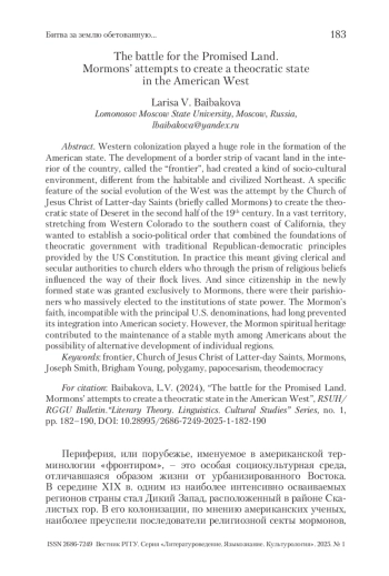 Колонизация Запада сыграла огромную роль в формировании американского государства. Освоение приграничной полосы свободных земель во внутренних районах страны, называемой «фронтиром», создало своеобразную социально-культурную среду, отличную от обжитого и цивилизованного Северо-Востока. Специфической чертой общественной эволюции Запада являлась попытка создания адептами Церкви Иисуса Христа Cвятых последних дней (именуемых кратко мормонами) теократического государства Дезерет во второй половине ХIХ в. На огромной территории, простиравшейся от Западного Колорадо до южного побережья Калифорнии, они хотели учредить социально-политический порядок, представлявший сочетание основ теократического правления с традиционными республиканско-демократическими принципами, предусмотренными Конституцией США. На практике это означало наделение клерикальной и светской властью церковных старейшин, которые через призму религиозных воззрений воздействовали на образ жизни паствы. И поскольку гражданство в новообразованном государстве предоставлялось исключительно мормонам, то именно их адепты массово избирались в органы власти. Вероучение мормонской общины, несовместимое с господствовавшими в США деноминациями, долгое время препятствовало ее интеграции в американское общество. Однако духовное наследие мормонов способствовало поддержанию устойчивого мифа среди американцев о возможности альтернативного развития отдельных регионов страны.