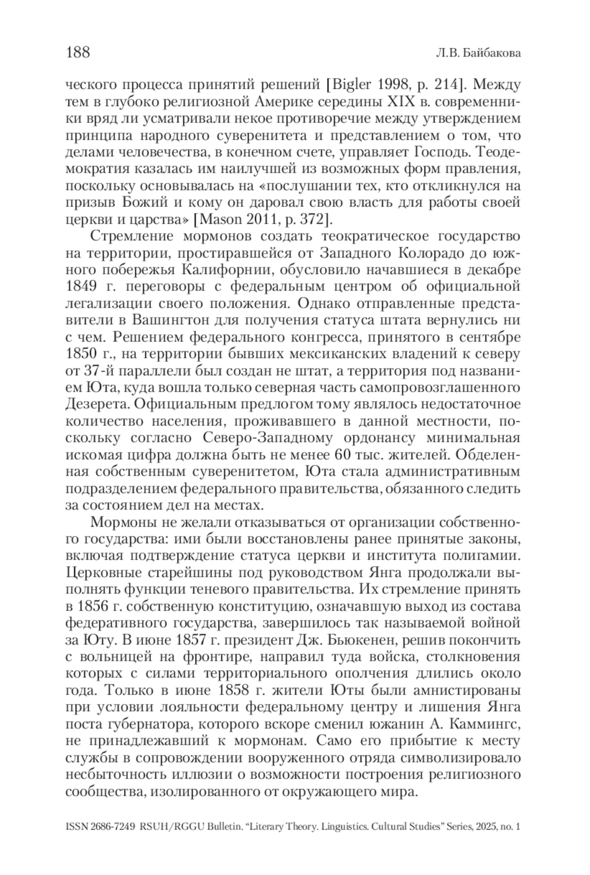 8. Mason 2011 - Mason P. God and the people. Theodemocracy in 19th century Mormonism // Journal of Church and State. 2011. Vol. 53. No. 3. Р. 349-375. https://doi.org/org/10.1093/jcs/csq135.