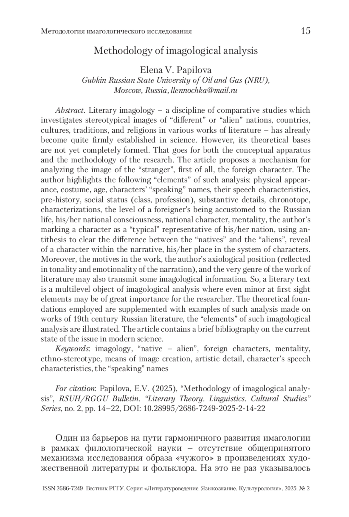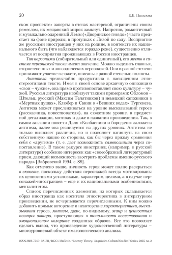 Литературоведческая имагология как дисциплина компаративистики (сравнительного литературоведения), изучающая стереотипные образы «других», «чужих» наций, стран, культур, традиций и религий в текстах художественной литературы, уже довольно прочно закрепилась в науке. Однако ее теоретические основы все же не сформировались окончательно. Это касается и понятийного аппарата, и методологии исследования. В статье предлагается механизм анализа образа «чужого», прежде всего – персонажа-иностранца. Автор выделяет следующие «элементы» анализа: портрет, костюм, возраст, «говорящие» имена героев, их речевая характеристика, предыстория, социальный статус (сословие, профессия), предметная детализация, хронотоп, высказываемые характеристики, степень «обруселости», национальное самосознание, национальный характер, менталитет, обозначение автором персонажа как «типичного» представителя своей нации, использование антитезы для выявления различий между «своими» и «чужими», раскрытие персонажа в сюжете, его место в системе персонажей. Кроме того, мотивы в произведении, ценностная позиция автора (выражающаяся в тональности повествования, его эмоциональном колорите) и даже сам жанр произведения могут также нести в себе имагологическую информацию. Таким образом, художественный текст – многоуровневый объект имагологического анализа, в котором даже незначительные, на первый взгляд, элементы могут нести в себе ценную информацию для исследователя. Теоретические положения подкреплены примерами анализа из русской художественной литературы XIX в. Статья содержит краткую библиографию по состоянию данного вопроса в современной науке.