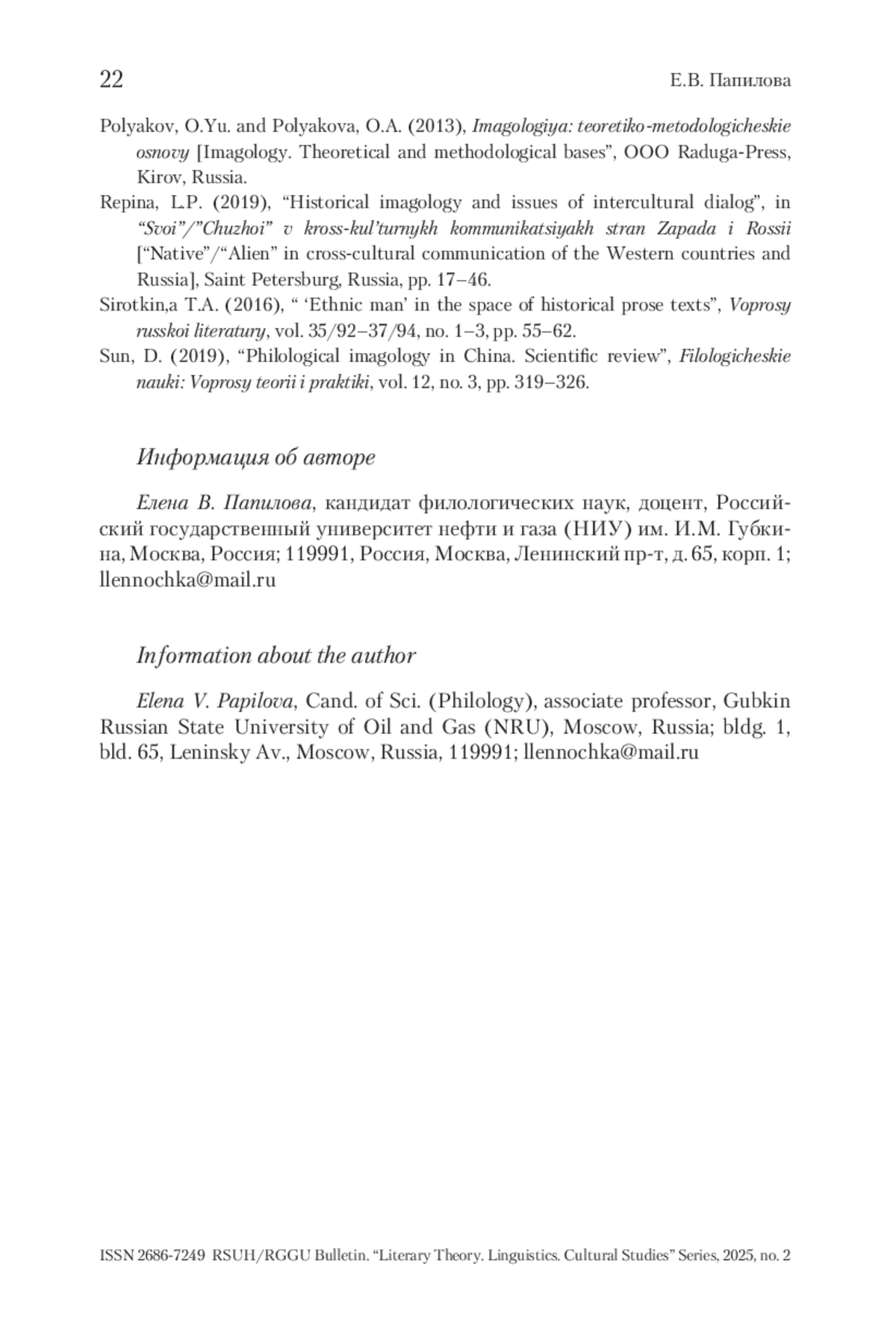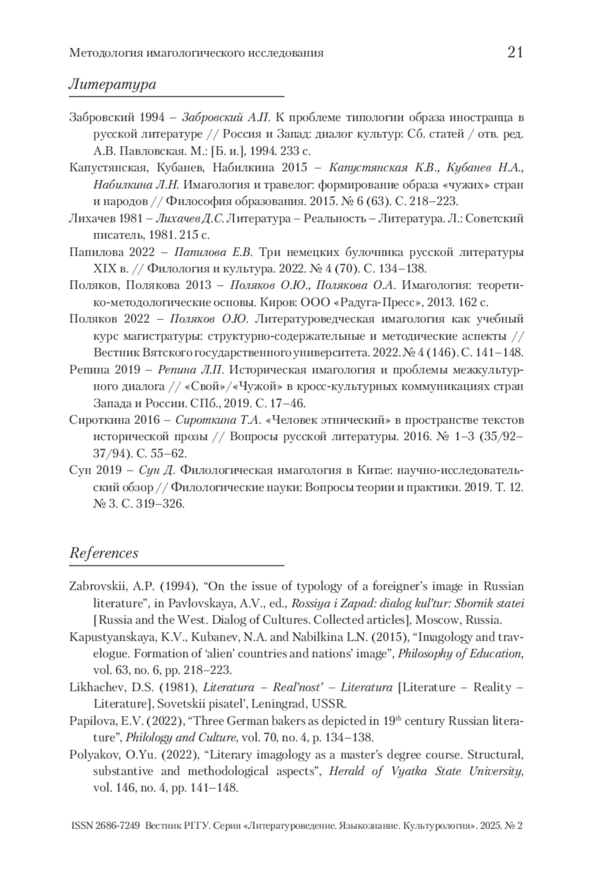 6. Поляков 2022 - Поляков О.Ю. Литературоведческая имагология как учебный курс магистратуры: структурно-содержательные и методические аспекты // Вестник Вятского государственного университета. 2022. №4 (146). С. 141-148.